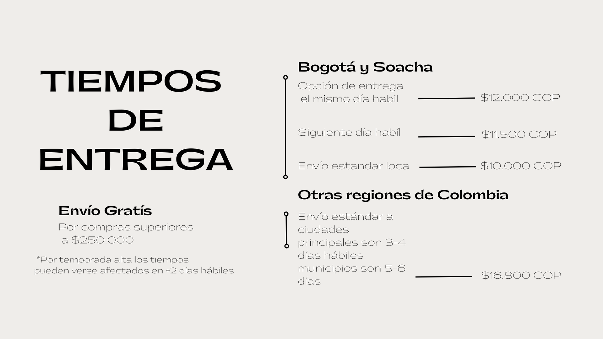 Por compras superiores a 250.000 $COP la entrega es GRATIS a todo el país. *No aplica para temporadas de descuentos.
